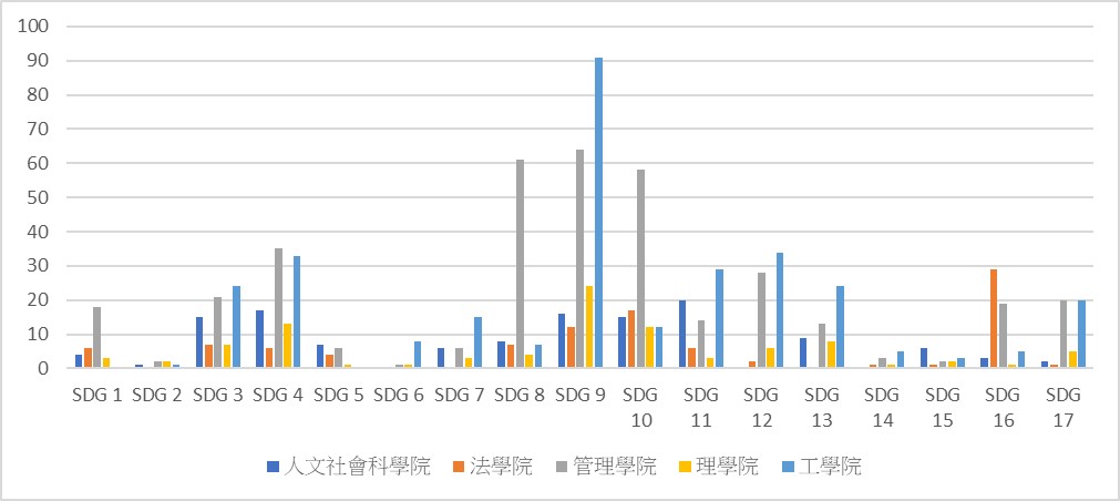 本校2023年各院課程對應SDGs指標之分布,其中人文學院以SDGs4教學品質、法學院以SDGs16和平與正義制度、管理學院以SDGs8就業與經濟成長、理學院以SDGs4教育品質、工學院以SDGs9工業、創新基礎建設為最高關聯性。