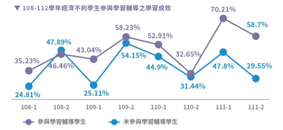 (二)辦理經濟或文化不利學生樂學讀書會:2019-2023年,參與學習輔導的學生成績進步比例平均為48.61%。2021年因COVID-19疫情改採線上讀書會,參與學生仍達154人次。。
