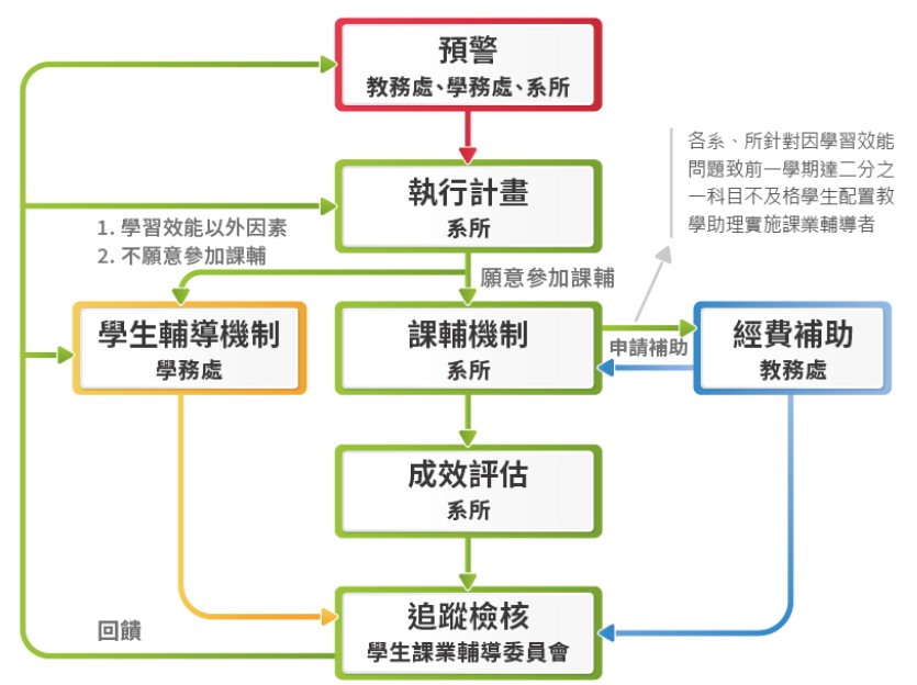 針對重點或需求較高之課程,及對學習高風險或經濟不利學生,加強輔導措施。如重點挹注學生課輔鐘點費、邀請學長姐擔任教學助理、一對一教學、線上教學、每學期定點定時提供課程諮詢輔導,使學生不及格的情形大幅降低,營造同儕共學共好之學習氛圍,達教學相長之效。