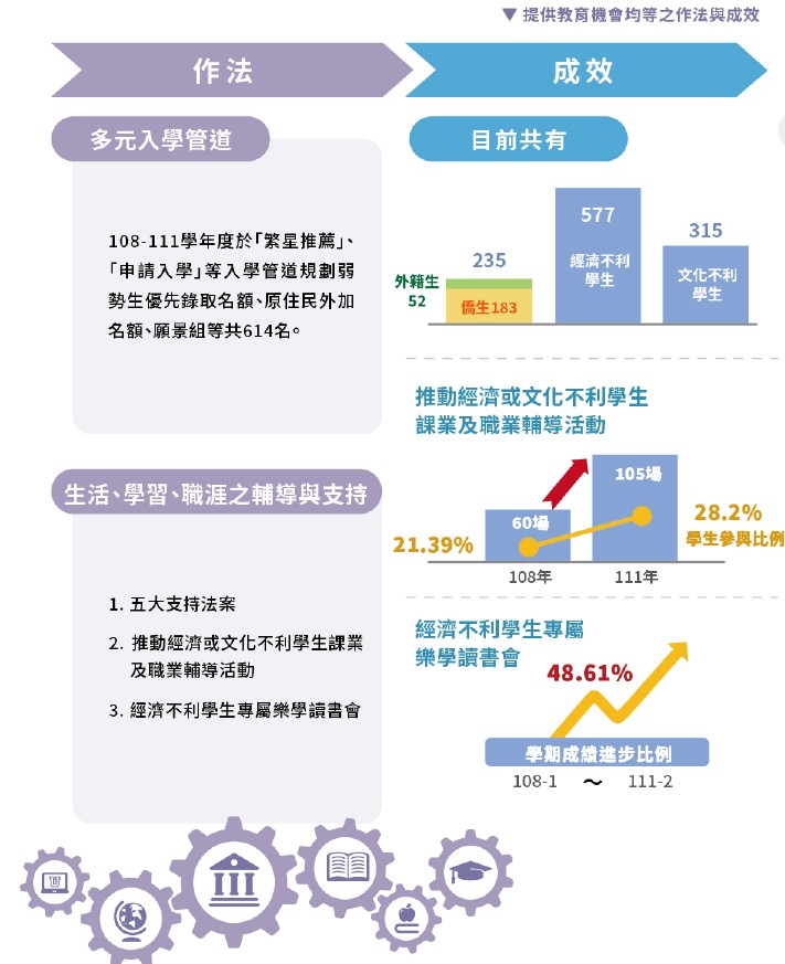 為了保障教育資源與機會均等,本校提供多元彈性的入學管道,推動弱勢學生願景計畫,優化經濟或文化不利學生的學習支持系統,以實踐高教公共性精神;同時為協助學生職涯探索,規劃職涯增能方案,成立互動社交平台提供豐富的教育資源與生活支持管道,並完善「學習輔導機制五大專法」,協助學生安心就學。