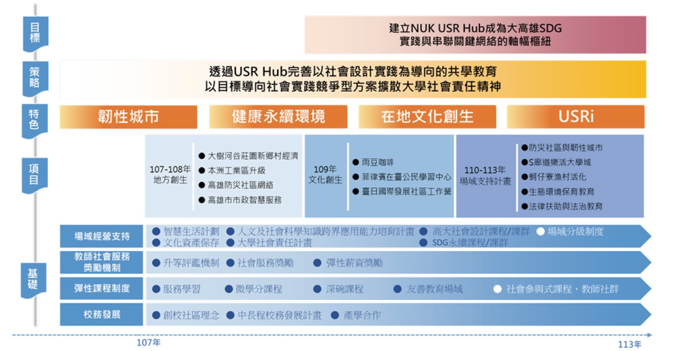 從由上而下支持過去計畫累積的場域經營特色,以及由下而上透過教學創新/高教深耕計畫推動社會設計與實踐課程/課群等串連方案,深化經營既有合作網絡,鼓勵教師從課程端引導學生深入了解社區的文化、歷史、產業等脈絡,積極參與及投入人力,讓師生走出學校與社區共學,最終提升高雄大學地區量能以形成USR大型計畫,增進在地對高雄大學的認同感。