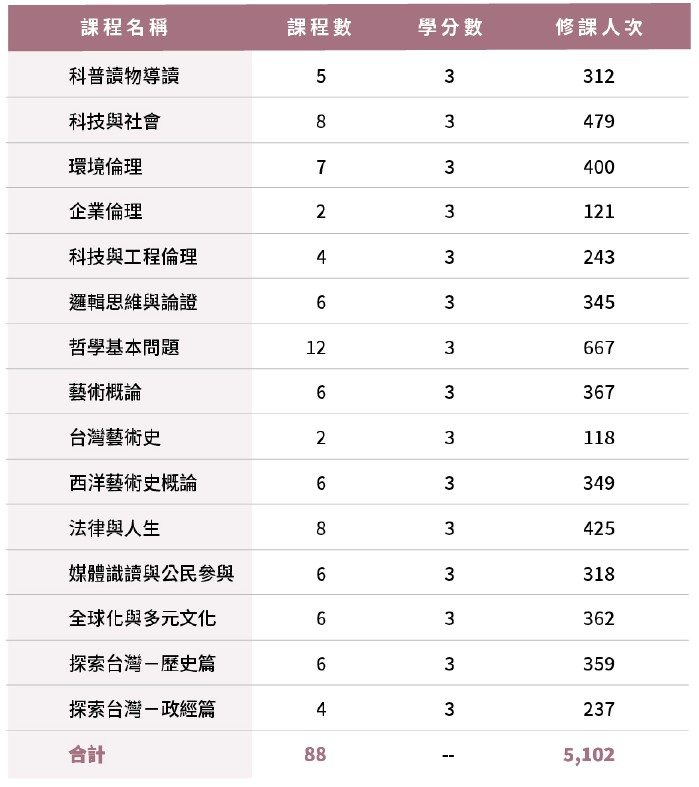 (1)課程規劃與人才培育:共同必修課程包含中文、英語會話與閱讀、體育、服務學習培養等科目,涵養學生基本能力;必修核心通識課程包含「思維方法、美學素養、公民素養、文化素養、科學素養、倫理素養」等六向度,符合校定基本素養之內涵;選修博雅通識課程分為「人文科學、社會科學、自然科學」等三類,培養學生跨域宏觀與永續競爭力。