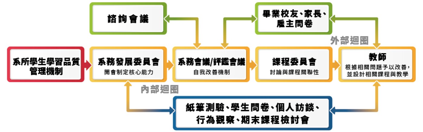 2.學習品質管理機制:各學系已建立完善的學生學習品質管理機制,除了配合全校性的調查外,並制定評鑑自我改善要點,定期召開系務會議、課程委員會、諮詢委員會與課程檢討座談會,透過與教師、學生、畢業校友、家長及學術界、產業界的意見交流,找出教學改善項目。