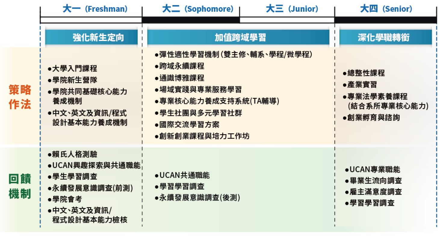 為確保課程與教學品質及學生學習成效,規劃教師多元教學及學生學習成果之檢核機制。課程與教學品質方面,規劃教學意見調查及教師教學評鑑;學生學習成效方面,則規劃學院會考,檢核基本核心能力,並透過學生學習調查,探究學生學習動機與歷程經驗,藉此作為未來分析、改善課程及教學品質之參據。