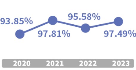 每學期初辦理中文書寫能力檢測,並依本校中文寫作能力指標暨寫作能力測驗規準評分。寫作能力四個向度與測驗內涵,包含語法與修辭、文章之結構與組識、主題論述之深度與知識性、創意思維與想像力等,2020-2023年各寫作核心能力達4級分以上比例均在90%以上。