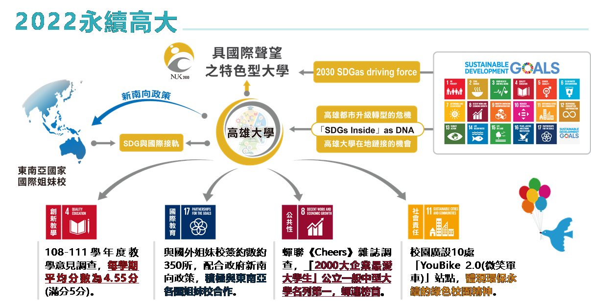 本校對內以SDGs(Sustainable Development Goals,簡稱SDGs)在地詮釋為核心驅動力,持續精進關鍵目標的實現和體制的完善,對外連結在地產官學策略聯盟與國際夥伴(東南亞大學),共同詮釋SDGs、USR與ESG 理念。我們將SDGs內化至高雄大學,配合行政院「數位國家‧創新經濟發展方案」、五加二產業創新、能源轉型及臺灣2050淨零排放策略等政策願景,培育國家發展所需之跨領域人才,藉由「SDGs-Inside」接軌國際,擬定「學用合一與跨域教學」、「特色研究與產業鏈結」、「永續大學與素養深化」及「社會責任、國際化與在地鏈結」等四大校務發展目標,致力於達到「結合教學研究與產業發展,重視人文素養與科技創新,培育精英人才之特色優質大學」之學校定位。