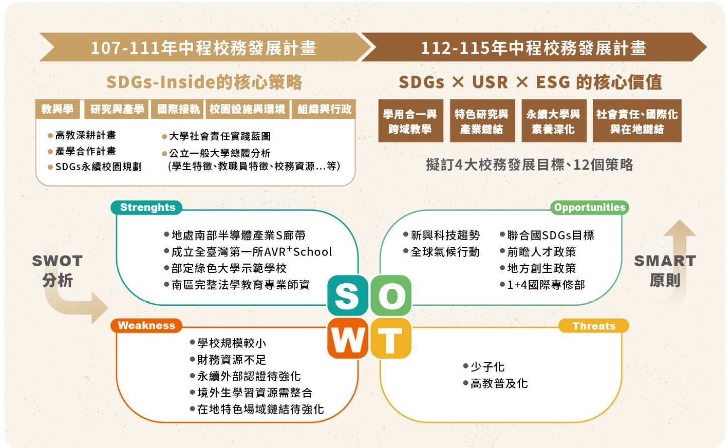 以本校核心理念及願景為出發點,配合本校短中長程校務發展規劃,擬定策略與行動方針,並視執行狀況進行滾動式調整: