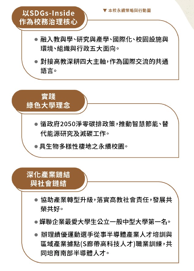 2009年本校因著對綠色大學執著與努力,獲選教育部綠色大學示範學校。又如日前「2023 年世界大學影響力排名(2023 THE Impact Rankings)」,本校在「SDG7(可負擔的潔淨能源)」、「SDG 12(責任消費與生產)」、「SDG 10(減少不平等)」與「SDG 11(永續城鄉)」項目均有亮眼成績。